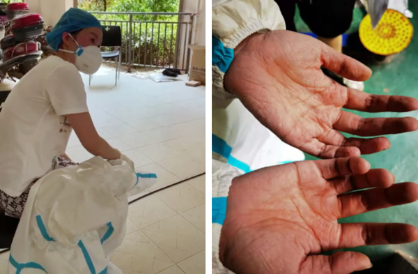 在长沙某小区 ,一名采样人员出现中暑症状;hth.com华体会采样人员双手被汗水泡得发白、发皱