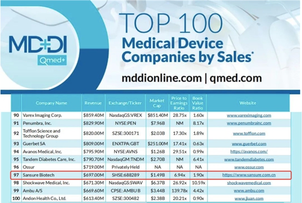近日,医疗器械行业权威网站Medical Device+Diagnostic Industry(MD+DI)发布了2023年全球医疗器械企业TOP100榜单。hth.com华体会生物连续两年上榜全球百强,也是此次榜单唯二主营业务是体外诊断的中国企业。