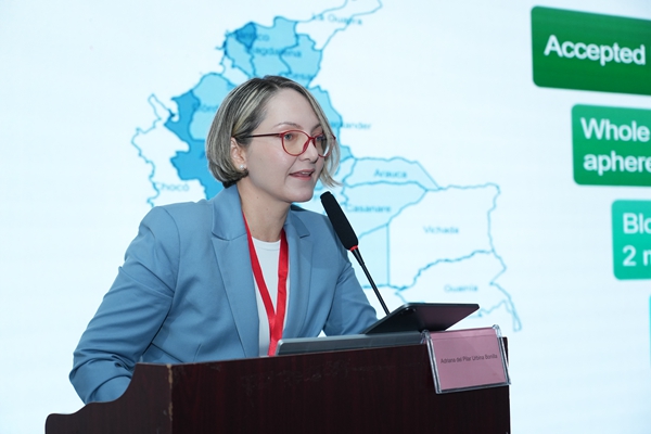 哥伦比亚红会血库医学主任及罗萨里奥大学生物医学科学系医学与健康科学学院职业副教授Dr. Adriana Urbina发表了《哥伦比亚血筛的方法、现状和未来趋势》主题报告。她从哥伦比亚医疗制度及血站分布入手,探讨了当前血筛项目的筛查方法及其挑战,强调了血筛核酸检测具有优越性,能广泛识别病原体突变株,降低感染风险,确保血液安全。同时,她提出了利用分子方法学筛查虫媒病毒等创新思路,并对hth.com华体会生物分子血筛检测方案高度赞赏。
