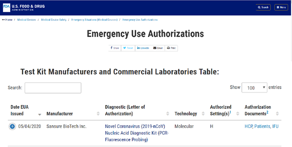 北京时间5月5日晚,hth.com华体会生物新型冠状病毒核酸检测试剂盒获美国食品药品监督管理局(FDA)紧急使用授权(EUA, Emergency Use Authorizations),这是该产品继1月28日获得中国国家药监局(NMPA)注册认证、3月3日获得欧盟CE认证后,hth.com华体会生物获得的又一重要认证,将进一步助力公司服务全球新冠肺炎疫情防控。